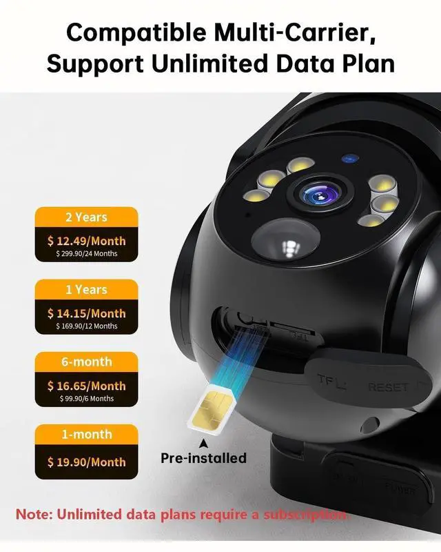 Pre-installed SIM Card: Comes with a pre-installed 4G LTE SIM card for each 4g security camera, which is compatible with major US networks (Verizon, T-Mobile, and AT&T). Automatically connects to the strongest signal in the local area while you are pairing the network. It provides 7-day trial data to get started, with flexible unlimited data plans ( need subscription, $ 19.90 /month or $ 169.90 /year per camera) available through the UBox app for continuous monitoring. ^^ Take control of your property security: The Tefrio non wifi security camera utilizes advanced PIR motion detection technology to minimize false alarms. Upon detecting motion, it immediately sends alerts to your phone, while the built-in alarm helps deter intruders and protect your property. If you experience property loss at your construction site, farm, or vacation home, you can review the recorded event video which stored on a memory card (not included) or in the cloud (separately subscription required) to obtain evidence. ^^ Color Night Vision and