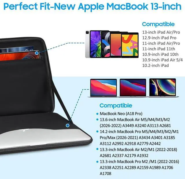Wide CompatibilityCompatible with MacBook Neo (A18 Pro), 13.6 -inch MacBook Air M5 A3449 M4 A3240 M3 A3113 M2 A2681 (2026 2025 2024 2023 2022), 14.2 -inch MacBook Pro M5/M4/M3/M2/M1 Pro/Max A2918 A2992 A2779 A2442(2026-2021); 13.3 -inch MacBook Pro M2 M1/A2338 A2251 A2289 A2159 A1989 A1706 A1708; 13.3 -inch MacBook Air M1/A2337 A2179 A1932; iPad Pro 13-inch M4, iPad Air 13-inch M2 2024, 12.9 -inch iPad Pro 6/5/4/3 Gen keyboard case; Surface Laptop 13", Surface Pro 12", Surface Laptop 13.8 '' 7 2025, 13.5 '' Surface Laptop 6/5/4/3/2/1, 13.5 Surface Book 3/2/1, Surface Pro 9/8/X/7/6, Dell XPS 13, and tablets up to 12.9 inches.