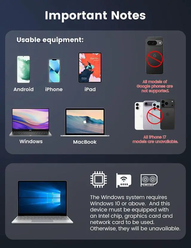Note: This product doesn't work with Google phones. If you're using a Windows device, make sure it has Intel chips, graphics cards, and network cards; otherwise, you won't be able to use it.