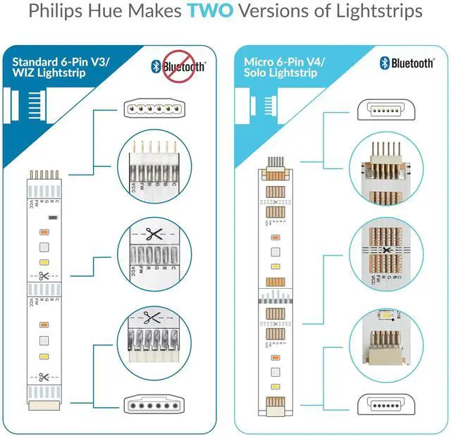makes two lightstrip versions: Standard 6-Pin V3 which has larger pins (compatible with the WiZ and Hue v3 lightstrip) and Micro 6-Pin V4 which has smaller pins (compatible with the Solo and Hue v4 Lightstrip). Check the comparison image which shows both connector types to confirm before purchasing.