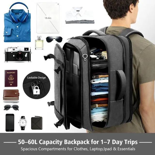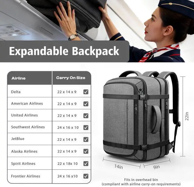 Carry On Space: Compact 22 14 5.5 inches travel backpack designed for airline travel and daily commuting, expanding to 22 14 9 inches to deliver 5060L capacity for 37 day trips, weekend travel and flights. This carry on backpack fits easily in overhead bins and works as an airline approved travel backpack. Padded sleeve fits up to an 18.4 inch laptop and 14 inch tablet with organized compartments for clothes, shoes and tech accessories ^^ 180