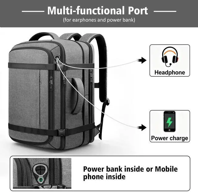 Lay-Flat Clamshell Opening: Suitcase style travel backpack with TSA friendly lay-flat design opens flat for fast packing and easy access to packing cubes, helpful at TSA checkpoints and airport screening. Compression straps keep items secure and reduce shifting, making this carry on backpack ideal for business travel, longer trips, carry on flights and extended travel ^^ USB Cable Port for