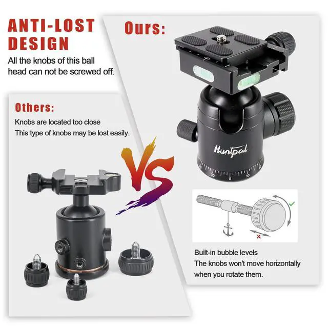 ANTI-LOST AND LOCKING KNOBS: The HPBK36 tripod ball head features three locking knobs for horizontal, vertical, and side adjustments. The knobs cannot be screwed off, increasing the stability of the ball head and ensuring each part is securely locked ^^