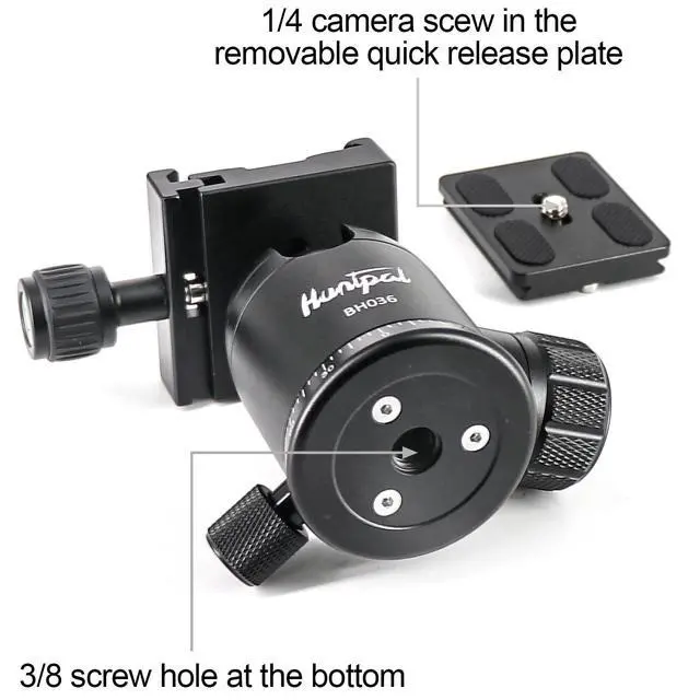 VERSATILE COMPATIBILITY: The HPBK36 tripod ball head has a standard 1/4" screw compatible with many hunting shooting accessories, and a 3/8" thread compatible with tripods, bipod and monopods. The ball head also comes with a quick-release plate for easy installation of hunting shooting devices