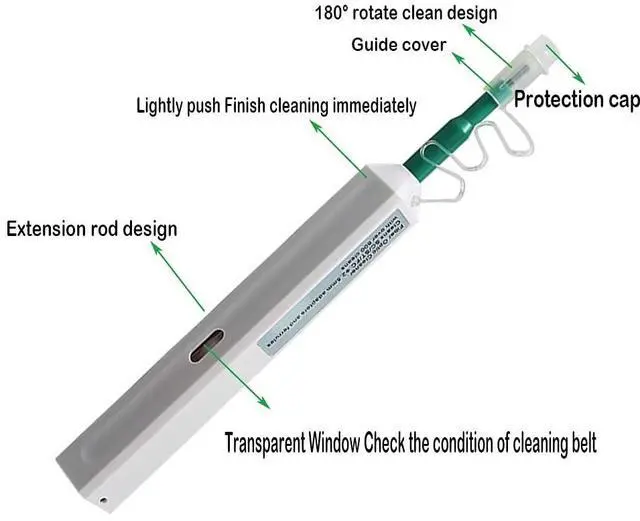 Product DescriptionUniversal 2.5 mm Ferrules SC/FC/ST PenLow Cost Per Clean, Up to 800+ CleansCleaning System Rotates 180for A Full SweepCleaning Micro Fibers Are Densely Stranded and Debris FreeCleaning Pen for simplex connections are simple to use and highly effective at removing oil and dust contaminants that can negatively impact optical performance. Zeasun Cleaning Pen for 1.25 mm connectors. Designed for standard SC/FC/ST. How to use1. Remove Guide Cap from the device. /Open the Cover on the Guide Cap. 2. Insert tip of cleaner into SC Adapter. /Insert connector into the Guide Cap.