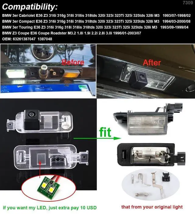 Dear customer, please must check the camera size and appearance before place a order, see if can fit your car license plate place size and appearance! Because the same car model in different countries may have some difference, please check the camera size and compare the installation of your car carefully to avoid mistake. This product could fit for all below models as expected: Replacement for BMW 3er Cabriolet E36 Z3 316i 316g 318i 318is 318tds 320i 323i 323Ti 325i 325tds 328i M3 1993/07-1998/02Replacement for BMW 3er Compact E36 z3 316i 316g 318i 318is 318tds 320i 323i 323Ti 325i 325tds 328i M3 1994/03-2000/08Replacement for BMW 3er Touring E36 Z3 316i 316g 318i 318is 318tds 320i 323i 323Ti 325i 325tds 328i M3 1993/09-1999/04Replacement for BMW Z3 Coupe E36 Coupe Roadster M 3.2 1.8 i 1.9 i 2.2 i 2.8 i 3.0 i 1996/01-2003/07OEM: 63261387047