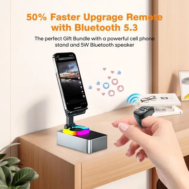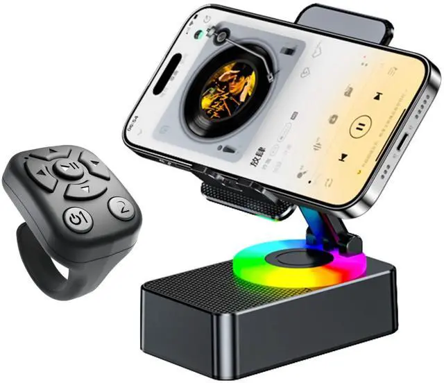 , and also support the remote control to take pictures and videos and shoot short videos and so on. ^^ The Best Christmas Gift with Quality AssuranceSleek and minimalist design with smart to make life easier, we provide up to 12 months of quality assurance services as the original brand after-sales worry-free. ^^ Powerful Wireless Bluetooth Speaker inside the Cell Phone StandDriven by 52mm large speakers, up to 5W power output for Powerful deep bass, also built-in microphone for hands-free calls, a 1500mAh battery inside supports 8 hours of continuous playback ^^ Multifunctional Retractable and Foldable 360-degree Rotating iPhone Stand The holder supports 360 rotation with a damping knob, retractable bracket structure design at the same time foldable for portable, load-bearing capacity of more than 2kg, ipad, kindle and cell phones can be applied.
