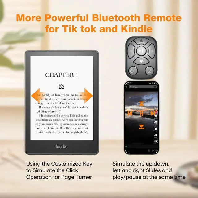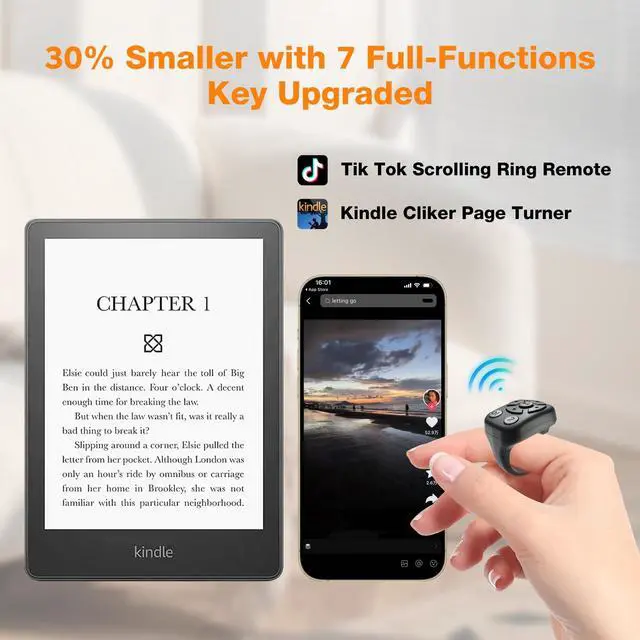 Upgraded Smaller and More PowerfulCKG Launched New Tik tok scrolling ring with a 30% size reduction, 50% faster response, and more stable connection based on Bluetooth 5.3 upgraded, also with ultra-low power consumption made 7 days of normal use on a full charge and long standby 15 days. ^^ 7 Full-function Buttons Include One CustomizableThrough the 7 buttons full functions could simulate up and down slides and left and right slides, and customize the click position, with smartphones, tablets, and Kindle adapted to all remote control operations, including turn page for short videos or Kindle books, Switch tracks for music, etc.