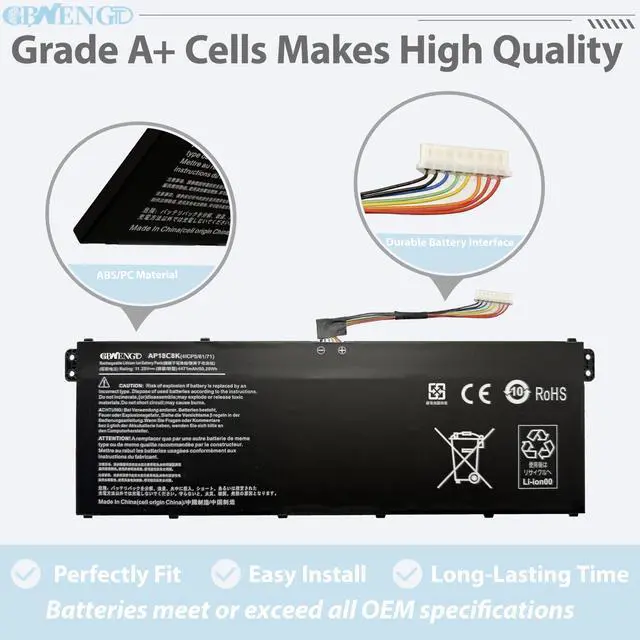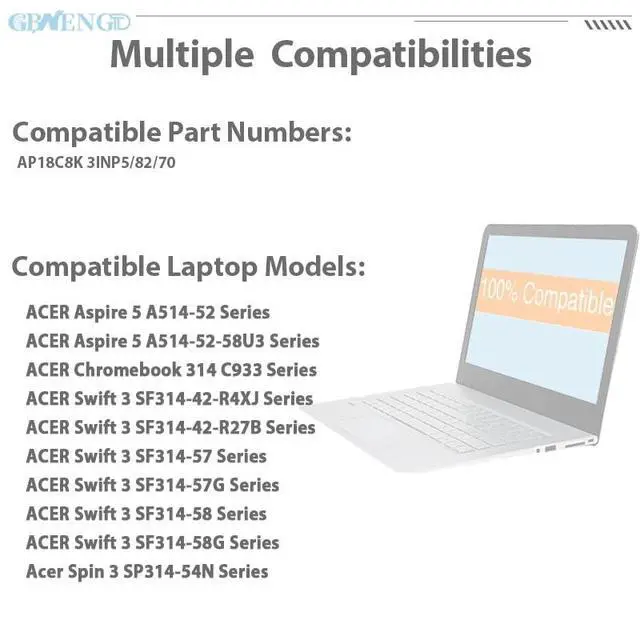 Battery Condition: 100% brand New from Manufacturer. ^^ Compatible Model Aspire 5 A514-52 Series Aspire 5 A514-52-58U3 Series Chromebook 314 C933 Series Swift 3 SF314-42-R4XJ Series Swift 3 SF314-42-R27B Series Swift 3 SF314-57 Series Swift 3 SF314-57G Series Swift 3 SF314-58 Series Swift 3 SF314-58G Series Spin 3 SP314-54N Series ^^ Compatible Part No# AP18C8K 3INP5/82/70 ^^ Quality First We have passed a series tests of short circuit, overheating, and overload protection before shipments. The newest generation chips, grade A cell battery, provide long cycle life, stable performance and broad compatibility. ^^ Service First-rate We promise 30-Day Refund & 1-Year Warranty. For any battery questions, just feel free to contact us for help via the order or click on"GBNENGTD", then you can see "Ask a question" on the page. We are here to serve for you for any battery problems within 24 hours.