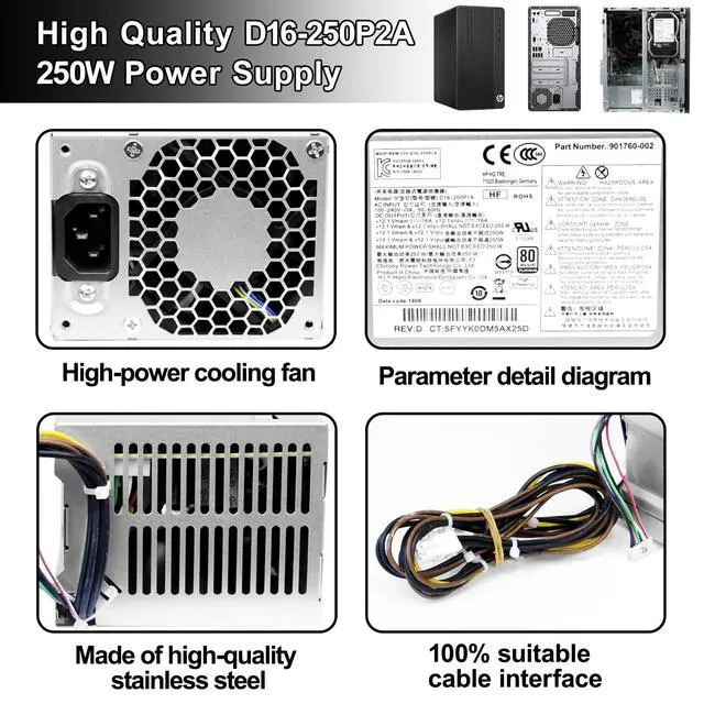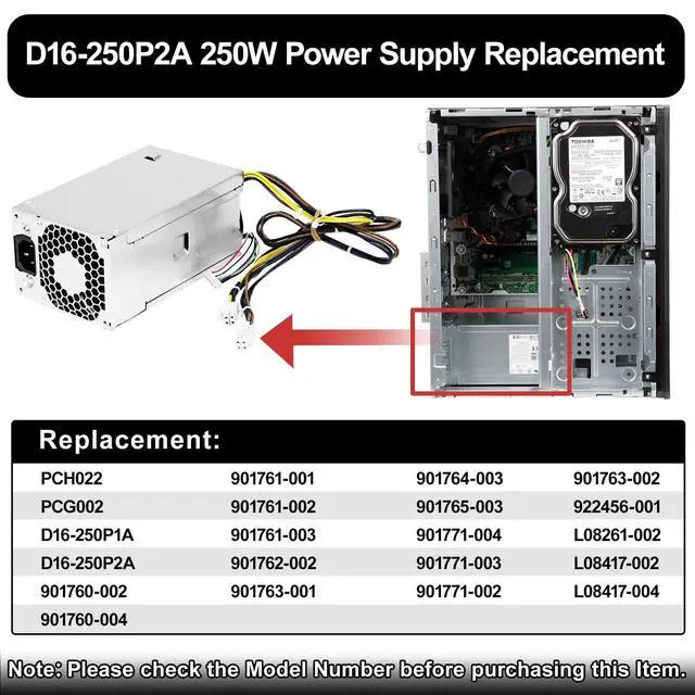 D16-250P2A 250W Power Supply Compatibility250W D16-250P1A Power Supply Compatible with 250W HP Power Supply Compatible with HP ProDesk 280 282 600 800 G3Compatible with HP ProDesk 480 400 G4Compatible with HP ENT18 92pct ^^ Replaceable Part NumbersD16-250P2A Power Supply replaces PCH022PCG002 Power SupplyD16-250P1A and 901760-002 Power Supply901760-004901761-001 Power Supply901761-002901761-003901762-002 901763-001901763-002 901764-003901765-003901771-004 901771-003 901771-002also 922456-001L08261-002L08417-002L08417-004901762-004PCG004PCG007 ^^