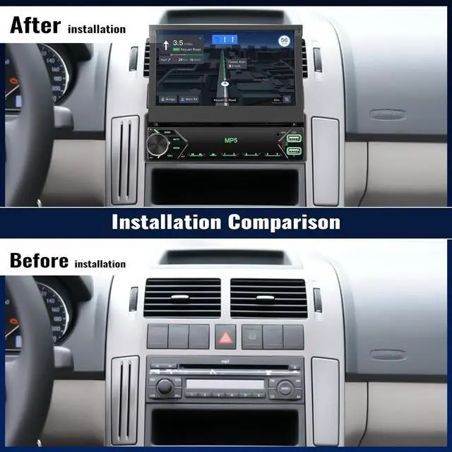 Installation size: 7.4" (L) * 7.28" (W) * 2.28" (H), universal for single din cars, can fit most vehicle ^^ Wireless CarPlay & Android AutoThe 7 inch single din flip out car stereo supports wireless carplay and android auto. If you connected your phone to the device one time, you can simply get into your car and your smartphone will automatically connect to the 1 din 7" IPS touch screen radio. With carplay and android auto function, you can get direction from GPS navigation app from phone like Go-ogle maps to plan the route and access your phone's contacts, emails, notifications, maps and music ^^ Upgrade Phone Mirror Link for Android/iOSUsing mirror link function to sync your cellphone to the single din manual flip up screen car stereo by USB cable and enjoy all functions from your phone such as maps, movies, music and more. Some apps that are not supported by CarPlay or Android Auto (such as Yout-ube) can be displayed on the 1 din 7 touch screen bluetooth car radio via mirror link function ^^ Built-in Bluetooth, FM Radio, EQ SoundThis 1 din wireless android audio receiver can be paired with your phone via bluetooth to make hands-free calls and play music, etc.