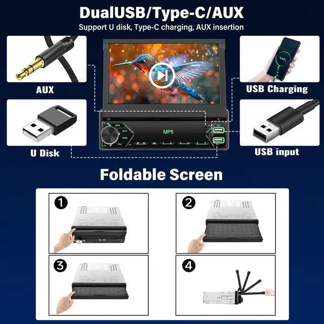 7 Inch Single Din Flip Out Car Stereo7" IPS digital retractable 1024*600 high definition capacitive LCD touchscreen car radio, so you can get more smoothly and precisely experience. Our 1 din manual 95 degree foldable screen MP5 media player with dynamic menu interface, builds in high quality stereo audio, with TF/USB/Type-C/AUX-in port, 7-color key backlights adjustable, SWC, rear camera input.
