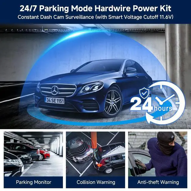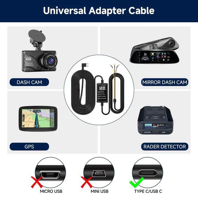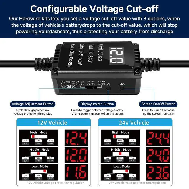 [Real-Time Voltage Display] --- This advanced dash cam hardwire kit features a built-in voltage monitor that enables real-time viewing of your vehicle's electrical status. Adjust the low-voltage protection threshold via the toggle switch: the selected cutoff voltage must be set higher than the vehicle's current voltage to maintain output. If set too low, the hardwire kit will not activate (the current vehicle voltage can be read on the digital display) ^^ [24/7 Parking Monitor] --- This power adapter system provides 24/7 parking surveillance, capturing incidents such as hit-and-run collisions, vandalism, or theft while your vehicle is parked and powered offhelping to safeguard your vehicle and provide essential evidence ^^ [Smart 3-Level Voltage Protection] --- The dash cam power cable enables 24-hour surveillance without the risk of a drained battery. Simply choose the voltage cutoff ( 11.6V, 12.0V, or 12.4V ) appropriate for your car battery and local climate. The hardwiring kit will then automatically disconnect when needed, ensuring your vehicle starts reliably every time ^^ [Low Voltage Protection Function Hardwire Kit] --- This Type-C dash cam hardwire kit is equipped with a precision voltage monitoring system that continuously tracks your vehicle's battery level in real time. When the battery voltage drops to the preset safety threshold 11.6V (12V input) or 23.6V (24V input) the adapter will automatically disconnect power, preserving sufficient charge to start your engine and protecting your battery from damage ^^ [Built-in ACC Mode] ---The universal dash cam hardwire kit Support ACC detection.