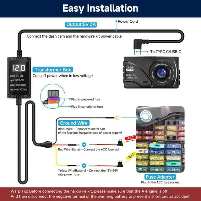 The yellow wire cable should be connected to the BAT+ fuse slot. The red wire cable should be connected to the ACC fuse slot. The Ground cable (Black wire cable) should be connected to any metal in the car. The 3 wire dash cam hardwire kit included 2pcs fuse tap to work with the hardwire cable. The usb c hardwire car kit comes w/ an adapter cable, 3-lead hardwire kit can support any dash cams ^^ [Widely Compatible Type-C Hardwire Kit] --- This 11.5 ft Type-C dash cam hardwire kit is compatible with most dash cams on the market, and can be directly connected to cars, trucks, SUVs, or buses for continuous power. Please ensure your dash cam has a Type-C/USB C port before installation ^^ [Easy-to-Install Dash Cam Hardwire Kit] --- This hardwire kit eliminates the need for a visible cable from the cigarette lighter, replacing it with a permanent, discreet wiring solution. Installation is straightforward and can be completed in minutes, requiring minimal technical skill. The kit includes plastic pry tools and connectors to help you safely access your vehicles fuse box.