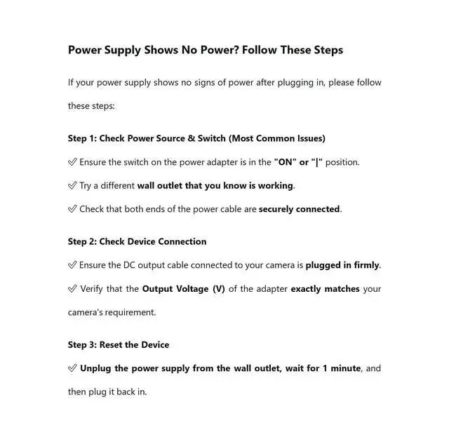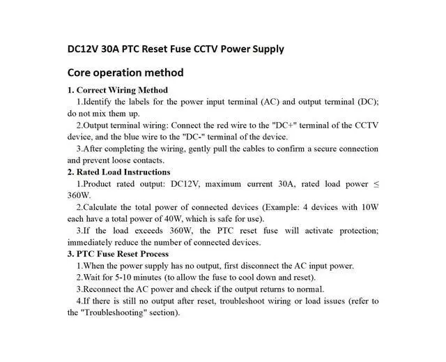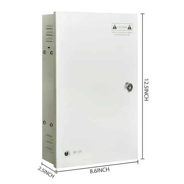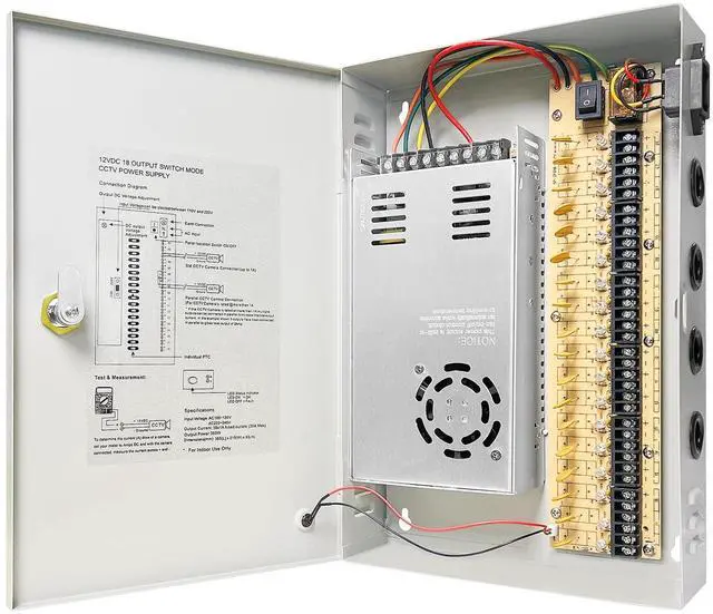 Amp: 1.6A mp/Channel; DC12V Regulator CCTV Power Supply Box, 18 Outputs with PTC Fuse. ^^ Important NoticeIf the power supply has no output, please troubleshoot using the following steps: 1. Verify correct positive and negative terminal connections (refer to wiring diagram below); 2. Check if the total power consumption of connected devices exceeds 360W (12V 30A); 3. Disconnect the power supply for 5-10 minutes, wait for the PTC fuse to reset, then reconnect. ^^ More convenience, no need to change the fuse. When over current happens, the power supply will automatically switch to self-protection status, after a while, the switch back to normal. ^^ The metal shell is Wear-resistant, long lasting, lock wit keys, safety to use. ^^ This DC12V 30 Amp Power Supply has 18 channels includes AC Plug and Lock.