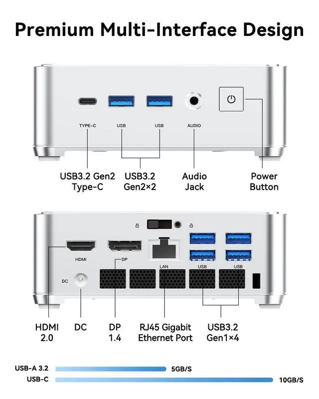 USB ports: 2 USB 3.2 Gen2 ports (10Gbps), 4 USB 3.2 Gen1 ports (5Gbps), and 1 full-function USB-C port (10Gbps + DP + PD). All ports are integrated into a palm-sized chassis, enabling direct connection to printers, keyboards, mice, and other devices without additional adapters ^^