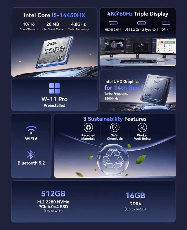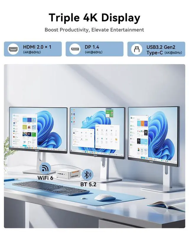 Display Support: With HDMI 2.0, DP 1.4 b, and a full-featured USB-C port (supporting DisplayPort Alt Mode, 10Gbps data transfer, and 15W power delivery), this mini desktop pc can drive three 4K@60Hz displays simultaneously. Paired with integrated UHD Graphics for 14th Gen Processors (max frequency 1.5GH z), it provides exceptional flexibility for office or digital signage use and handles video encoding like H. 264/HEVC with ease ^^ Wi-Fi 6, Bluetooth 5.2, and 7
