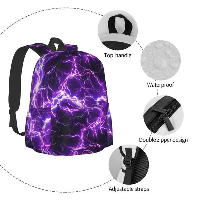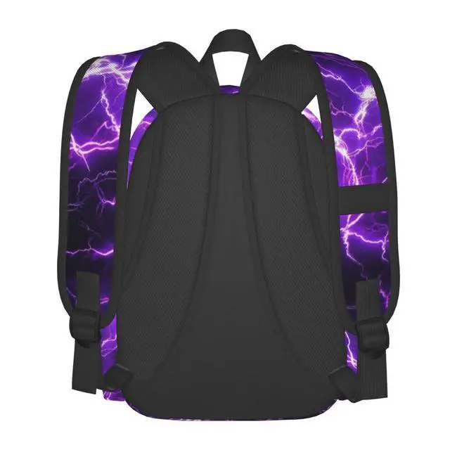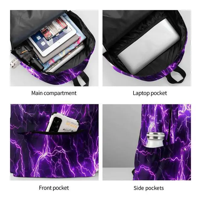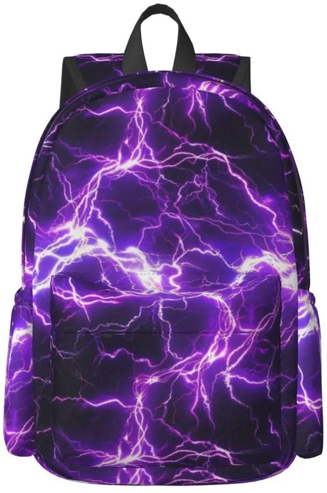 DESGIN: Vivid Black and Purple Lightning Cool print design backpack, the back of the backpack is ergonomically designed for greater comfort, Large-capacity design, main compartment inside, 1 small zipper front pocket; 2 side pouchs. Easy access 15-inch laptop and iPad compartment separate from roomy main compartment ^^