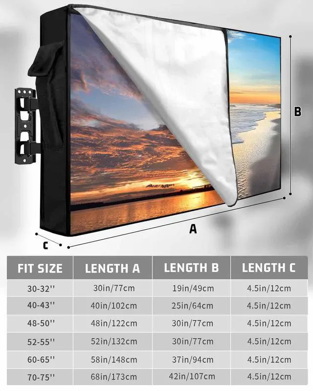 Outdoor TV Cover Size Chart30-32in /30x19x 4.5 in32 in smart tv40-43in /40x25x 4.5 in43 inch smart tv48-50in /48x30x 4.5 in50 inch tv52-55in /52x30x 4.5 in55 inch tv60-65in /58x37x 4.5 in65 inch tv70-75in /68x42x 4.5 in75 inch tvOutdoor TV Protector DesignFull coverage design avoids damage from the vivid elements, making your outside television always look like new. Warm TipsPlease measure the size of your TV accurately before purchasing a TV cover. Store the remote in the cover pocket. When youre ready to switch off and head indoors, always remember to place the remote inside its pocket on your outdoor TV cover.