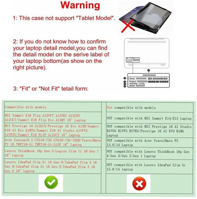 Warning: NOT compatible with MSI Prestige 16 AI Studio B1VGG B1VFG B1VEG/Prestige 16 AI EVO B1MG and NOT compatible with MSI Summit E14/E15 and Acer TravelMate P2 15.6 /14 and NOT compatible with Lenovo ThinkBook 16p Gen 4/Gen 3/Gen 2/Gen 1 and NOT compatible with Lenovo IdeaPad Slim 3i 15.6 /14 laptop {{Warning: Most of returned because of choosing wrong model, please confrim your laptop model}}. ^^ This protective cover is made of the high-quality PU leather, characterized by the beautiful appearance and fine hand feeling; the inner-layer soft cashmere can better protect the laptop. ^^ Unique design with two elastic rubber bands could solve the problem of loose cover effectively in the process of using laptop (This case not support "Tablet model"). ^^ Unique liner design for laptop cooling, this case do not affect the heat dissipation of the laptop. Our store have 500+ laptop models cases, search more laptop models's case, please search "Alapmk + your laptop model".