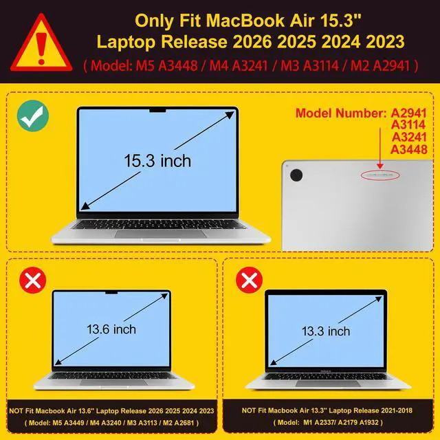 M5 Case: Only Fit for 2026 Release MacBook Air 15.3 inch Model A3448, Fit for 2025 Release MacBook Air 15.3 inch Model A3241, Fit for 2024 Release MacBook Air 15.3 inch Model A3114, Fit For 2023 Release MacBook Air 15.3 inch Model A2941 Please kindly check the model number A3448 OR A3241 OR A3114 OR A2941 on the back of the MacBook before your purchase. ^^ Warning Not Fit