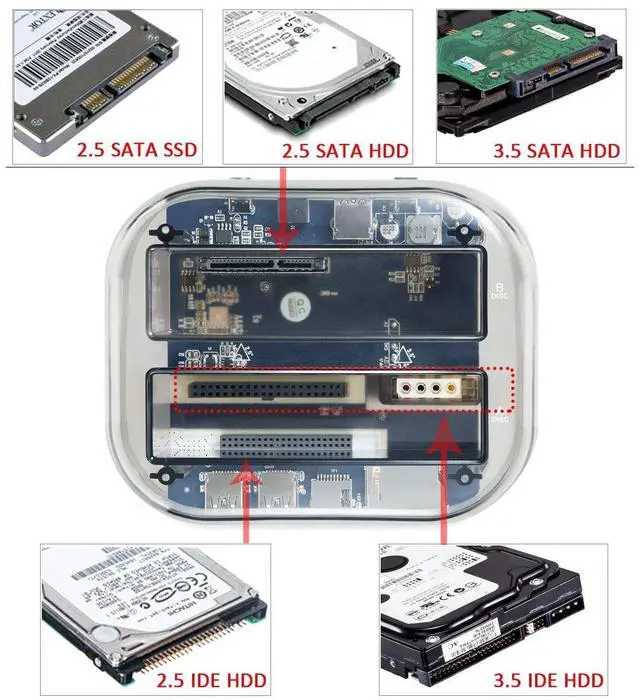 Universal compatibility: 1 IDE port + 1 SATA port, With adjustable IDE connectors, Supports all 2.5 "/ 3.5" IDE / SATA I / II / III hard disk and SSD, Maximum support 20TB SATA interface Hard disk, IDE interfaces maximum support 1TB hard drive. Please select the right model to avoid your order error.