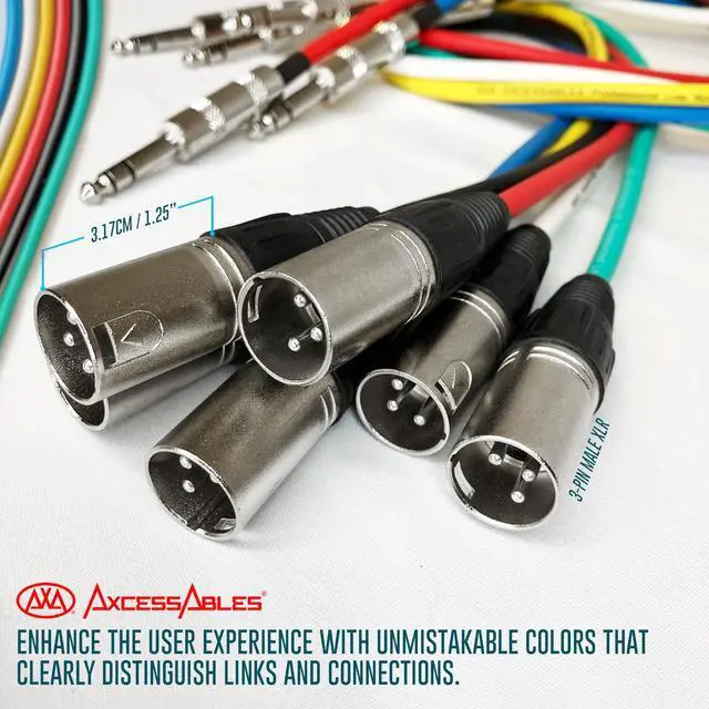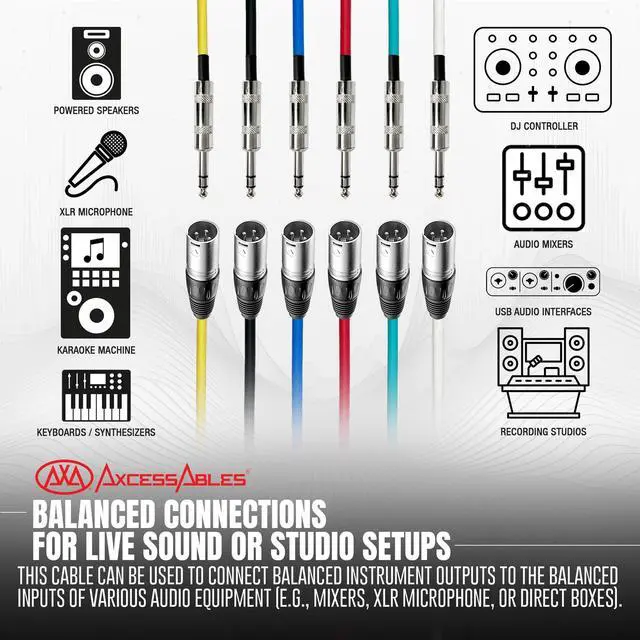 The casings are designed to securely tighten, providing added strength and reliability. ^^ AxcessAbles color-coded cables are perfect for efficient identification and organization purposes. The use of distinct colors allows for quick and easy recognition, making it simple to differentiate between various cables and streamline your setup. ^^ The TRS 1/4-inch ( 6.35 mm) stereo balanced male to female XLR connection is a versatile audio cable for instruments, studios, and various applications. It enables balanced audio connections, links line-level devices, connects effects loops, patches audio systems, and ensures high-quality balanced audio transmission.