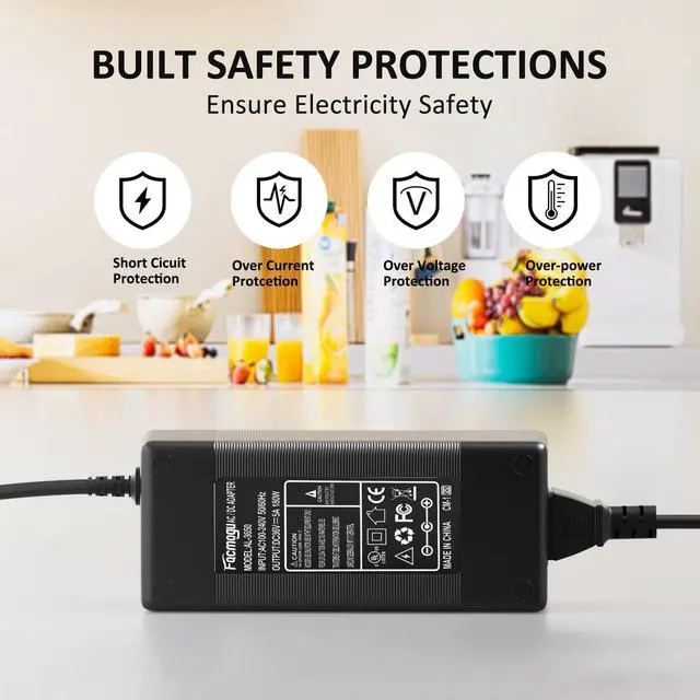 Supply Polarity: Center or Tip is positive (+), Sleeve is negative(-). ^^ Built-in Power Supply Protection-- Certified by UL, it ensures safe use with over voltage, over current, and over temperature protection to keep all of your mobile devices safe from unexpected surges and spikes. Wide voltage range from 100V to 240V makes it suitable for travel. ^^ Wide Applications-- It widely used to 36V equipment, such as car subwoofer amp, audio amp boards, portable powered speakers, audio/ video power supply, water purifier, massage chair, DC motor, DC pump, inkjet printer, laser engraver, electric drill and other 36V devices less than 180W.