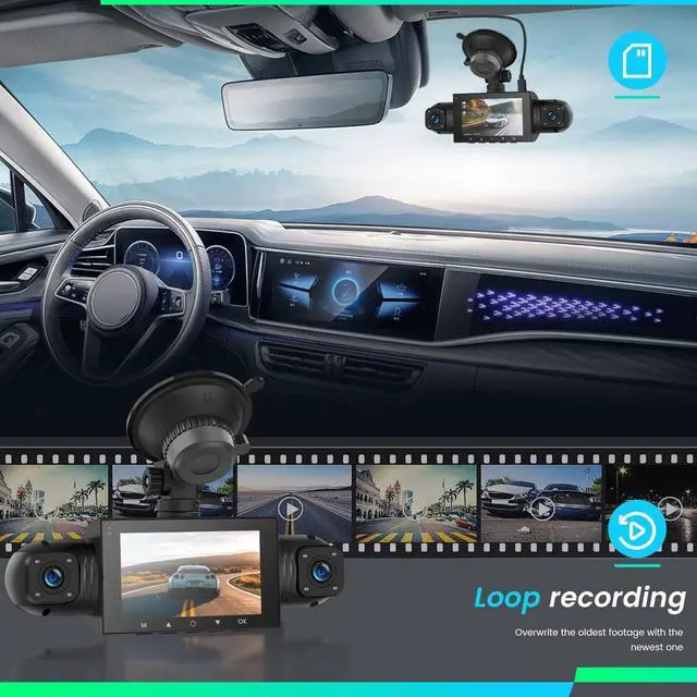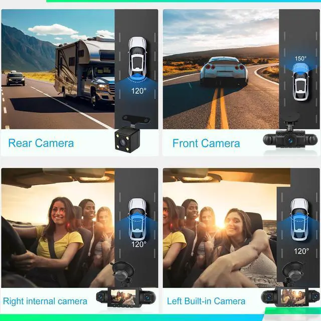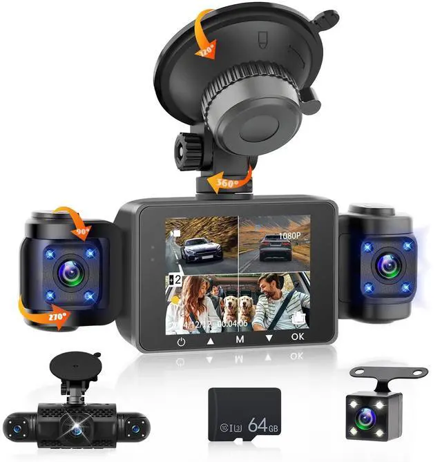 Dash Cam: four lenses, each capable of recording Full HD video simultaneously. This allows the camera to capture footage from the front, rear, left, and right sides of the vehicle at the same time. The 360 view dash cam for car eliminates all blind spots, providing complete evidence in case of side swipes, hit-and-runs ^^ Loop Recording & 64GB