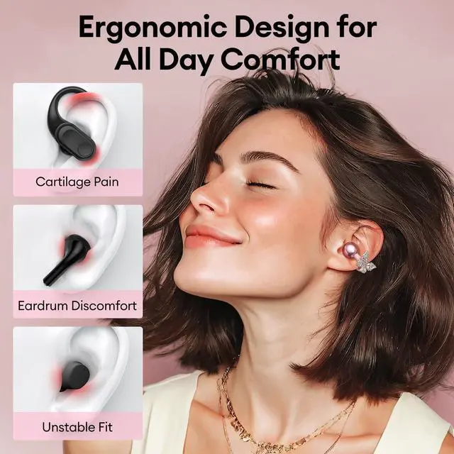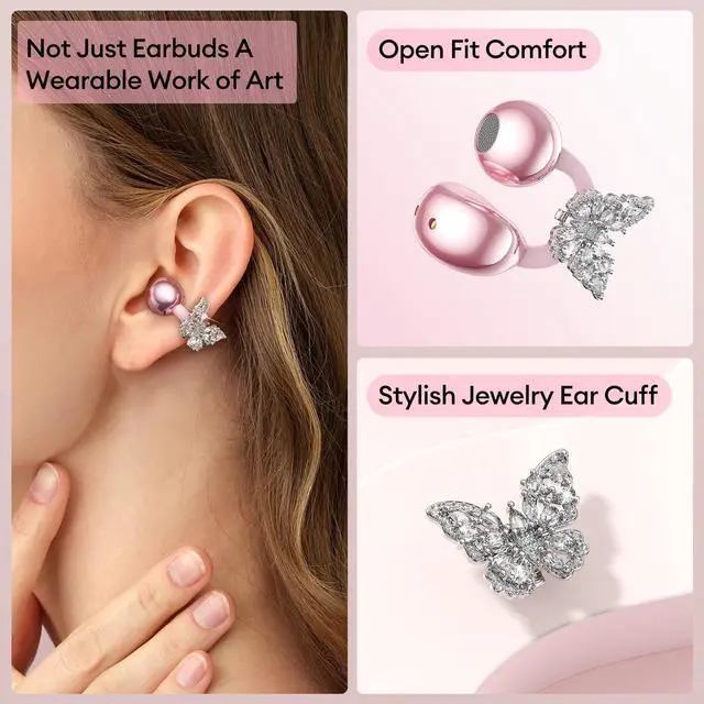 • Jewelry-Inspired Elegance Designed to Sparkle: Not just wireless earbuds - a chic fashion accessory. Featuring a removable butterfly earcuff with customizable designs, these open ear earbuds combine avant-garde style with crystal-clear sound. Wear them as a bold statement or a subtle accent-perfect to match your outfit or mood