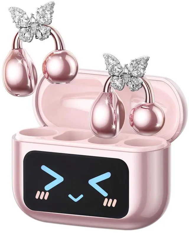 PAXA Stylish Open Ear Clip On Earbuds with Removable Butterfly Earring, Clip On Headphones with LCD Touch Screen, Fashionables Open Ear Headphones for Women, Butterfly Earring Rose Gold Earbuds