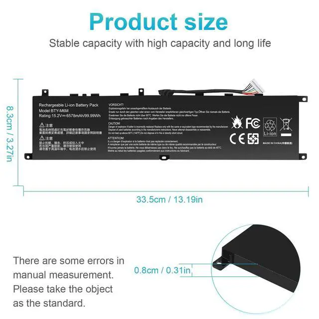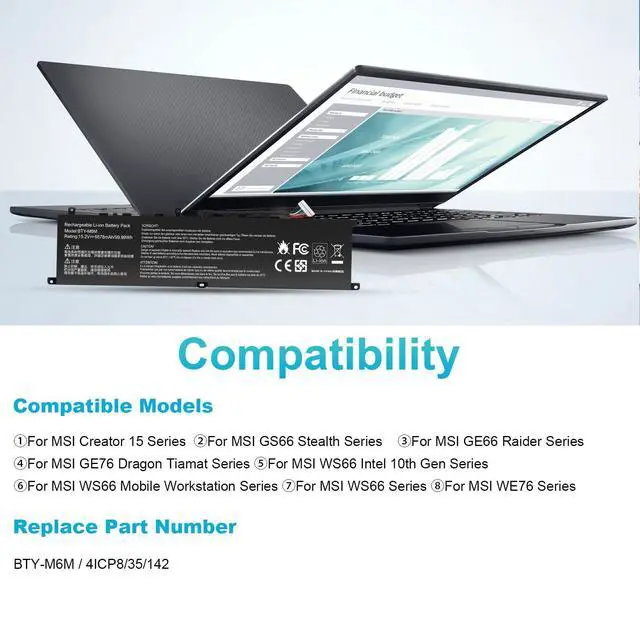 Compatible Models: for BTY-M6M / 4ICP8/35/142 Replacement For LaptopFor MSI Creator 15 Series For MSI GS66 Stealth SeriesFor MSI GE66 Raider Series For MSI GE76 Dragon Tiamat Series For MSI WS66 Intel 10th Gen Series For MSI WS66 Mobile Workstation Series For MSI WS66 Series For MSI WE76 Series Laptop ^^ All products are Certified by CE, FCC for safety. Strict guidelines for compatibility, and standards compliance for environment safety.