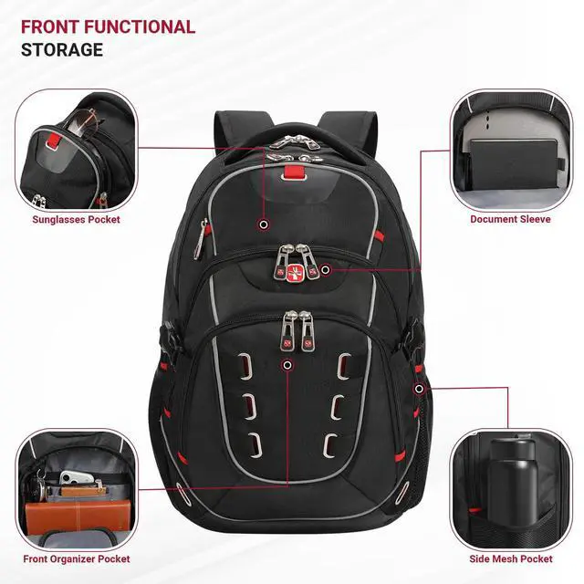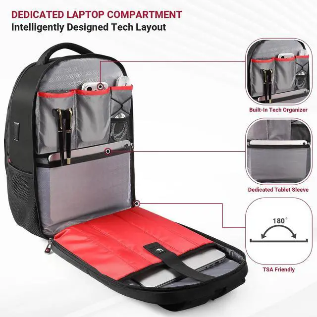 Backpack size fits airline carry on backpack requirements and a 17 inch laptop backpack comfortably. ^^ Large Capacity Laptop Backpack with Smart Organization-This large laptop backpack for work and travel is thoughtfully designed with 5 main storage zones: 1 front organizer pocket for documents, cables, and accessories 2 large quick access pockets for passport, wallet, or phone 1 spacious main compartment for clothes, headphones, or travel gear 1 separate laptop compartment Ideal as a business travel laptop backpack carry on for short trips or daily commuting. ^^ TSA Friendly Laptop Compartment with Enhanced Protection-The dedicated TSA-friendly laptop backpack compartment opens 180 for smooth airport security checks. Includes three electronic accessory pockets for phone, power bank, mouse, or recording devices, a separate iPad sleeve, and a red padded foam laptop compartment that protects laptops up to 17.3 inches during travel. ^^ Versatile Utility Carry On Laptop Backpack for Work, Travel & Daily Use-Designed as a business backpack for men, this professional yet modern backpack is perfect for office commute, business trips, and carry on travel. A reliable utility laptop backpack for professionals who need organized storage, large capacity, and a clean business style for everyday work and travel.