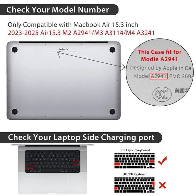 Check Your Macbook Model: Only compatible with MacBook Air 15 inch cover 2025 2024 2023 Release M4 M3 M2 Chip with Liquid Retina Display & Touch ID (Model: A3241 A3114 A2941). ^^ Please kindly check the model number "Axxxx" on the back of the laptop before your purchase, make sure you choose the exact model number: "A3241" "A3114" or "A2941" that compatible with MacBook Air15 inch M4 M3 M2 chip.