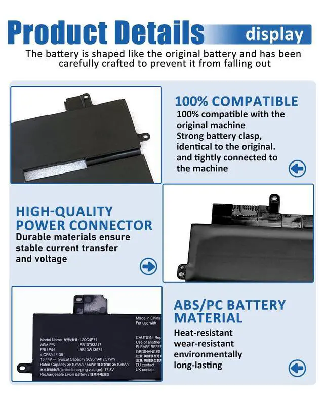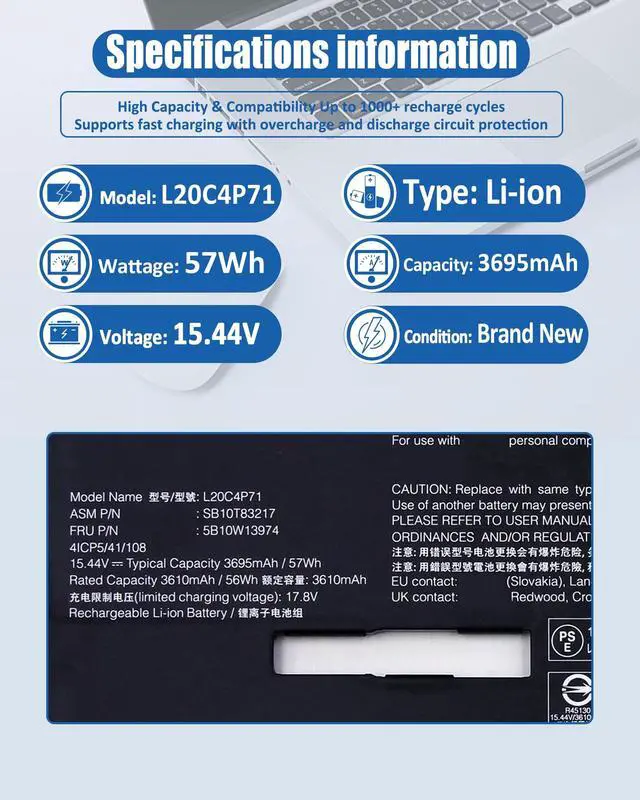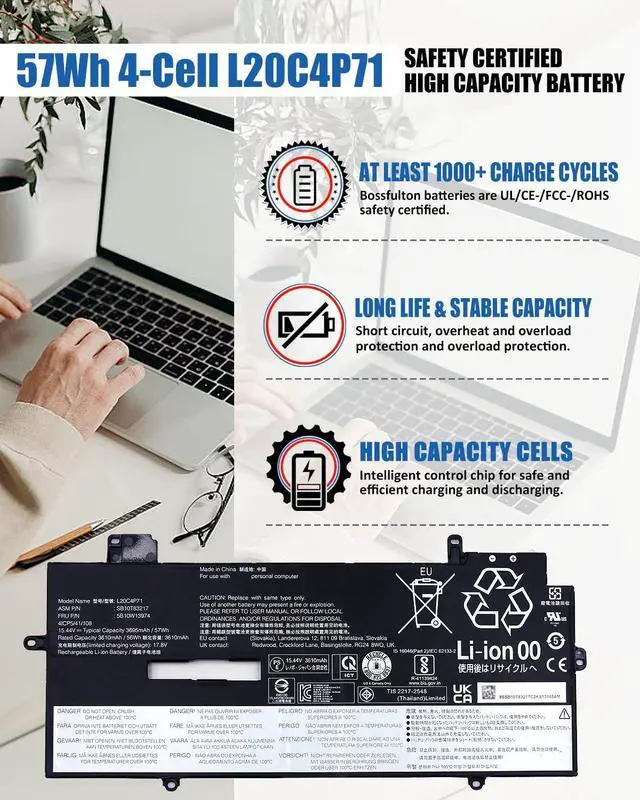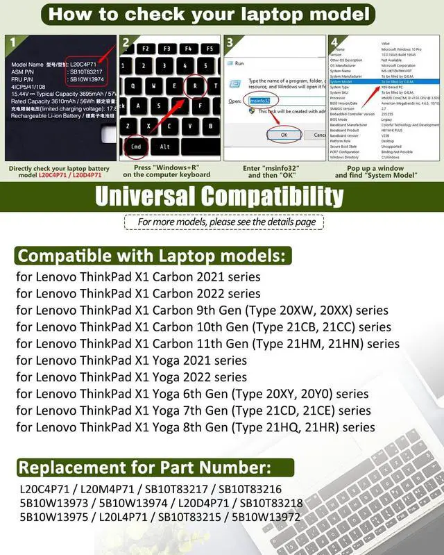 includes: 1x L20C4P71 Battery, 1 Set x Screwdrivers, 1x Instruction for L20C4P71 Laptop Battery ^^ Compatible Part NumberL20C4P71 / L20D4P71 / SB10T83217 / 5B10W13974 / SB10T83216 / 5B10W13973 / L20M4P71 / SB10T83218 / 5B10W13975 / L20L4P71 / SB10T83215 / 5B10W13972 / 4ICP5/41/108 ^^ Compatible Models Replacement For Lenovo ThinkPad X1 Carbon 9th Gen (X1 Carbon 2021) Series For Lenovo ThinkPad X1 Carbon 10th Gen (X1 Carbon 2022) Series For Lenovo ThinkPad X1 Yoga 6th Gen (X1 Yoga 2021) Series For Lenovo ThinkPad X1 Yoga 7th Gen (X1 Yoga 2022) Series ^^ What You GetA complete package for easy installation: One L20C4P71 Laptop Battery, One screwdriver set, One User Manual; For your peace of mind, we offer 30-day re-turns and a 12-month replacement. Our customer support team (responding within 24 hours) is always ready to assist. Visit our product page for more details, and don't hesitate to contact us if you need help.