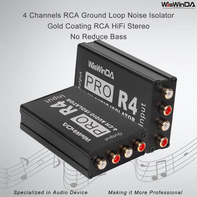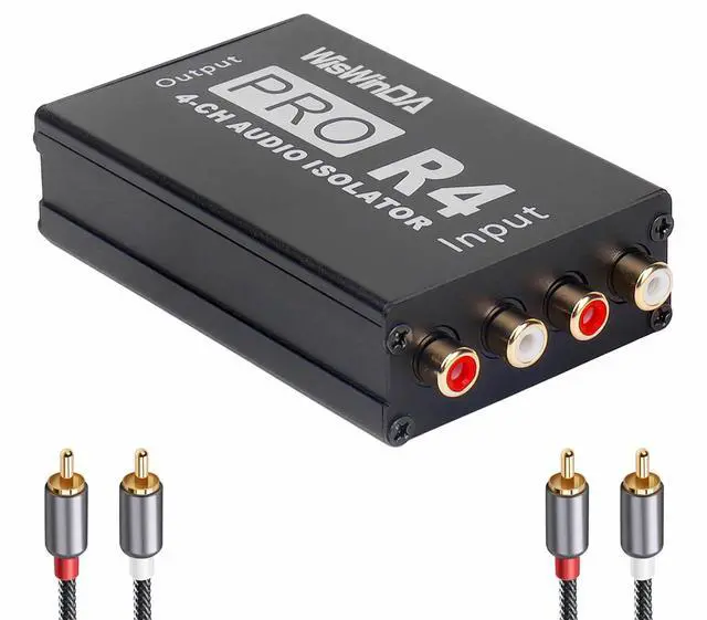 WisWinDa Pro RCA 4Channels HiFi Stereo Ground Loop Noise Isolator Gold Coating RCA Connectors Aluminum Shell Noise Filter for car and Home Using in Different situations (WDISO-AA02-RCA) ^^ WisWinDa Mini 4 Channels RCA Ground Loop Noise Isolator/Noise Filter RCA could help you to reduce the noise from the car&home audio electric system, gives you HiFi quality sound output. Perfectly solve car and home stereo noise problems. ^^ Hot-Swap Design--The Audio Isolation Transformer Alternator is easy to install, dont need any complicated tools, and it can be used after correct connecting RCA and gold coating cable White and Red.