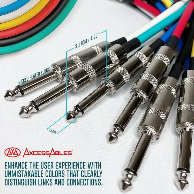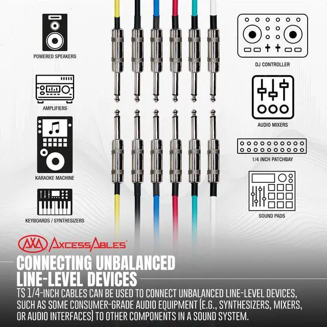^^ AxcessAbles color-coded cables are perfect for efficient identification and organization purposes. The use of distinct colors allows for quick and easy recognition, making it simple to differentiate between various cables and streamline your setup. ^^ The TS 1/4-inch ( 6.35 mm) mono unbalanced male-to-male connection is a versatile audio cable for instruments, studios, and various applications. It enables balanced audio connections, links line-level devices, connects effects loops, patches audio systems, and ensures high-quality balanced audio transmission. ^^ AxcessAbles provides a 1-year warranty, ensuring customer satisfaction. Our US-based support team is here to assist you with any technical issues or inquiries you may have.