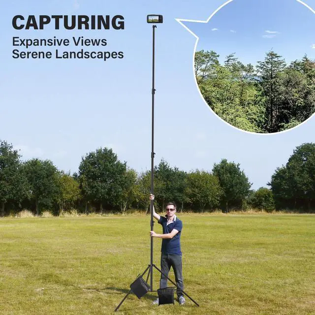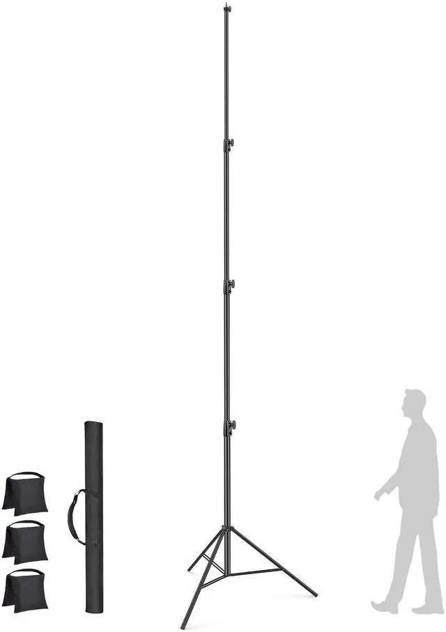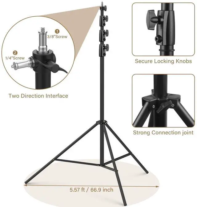 ^^ Durable & Stable: The Light stand has a minimum height of 3.94 ft/120cm and a maximum height of 16.4 ft/500cm. The payload capacity can go up to 22lbs/10kg. The stand weighs 8lbs/ 3.6 kg. It folds down to 4.6 '/140cm for storage and transport. ^^ 4 sections and 3 risers. Each section that extends is secured by a t-shaped turn knob. It has a 1/4''screw on top that will supports all major photo equipment, including reflectors, softboxes, lights, umbrellas, backgrounds and more. The lights stand made of carbon metal steel. ^^ Double-braced legs for added stability. It has a wide footprint of 52" for greater stability. 3 pack sands bag to keep it steady with heavier and higher loads that when fully extended and not worried about it getting tipped over. ^^ What's in the