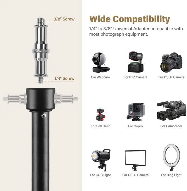 Spring-Cushioned: Keeps your fingers and mounted equipment safe from sudden drops if the locks are open, protects. Using it outside as a camera stand for sports games. The adapter ends are threaded with both 1/4'' and 3/8'', compatibility with various photographic equipment and light fixtures. Its three-way mounting interface can connect vertical and horizontal directions to meet different shooting needs.