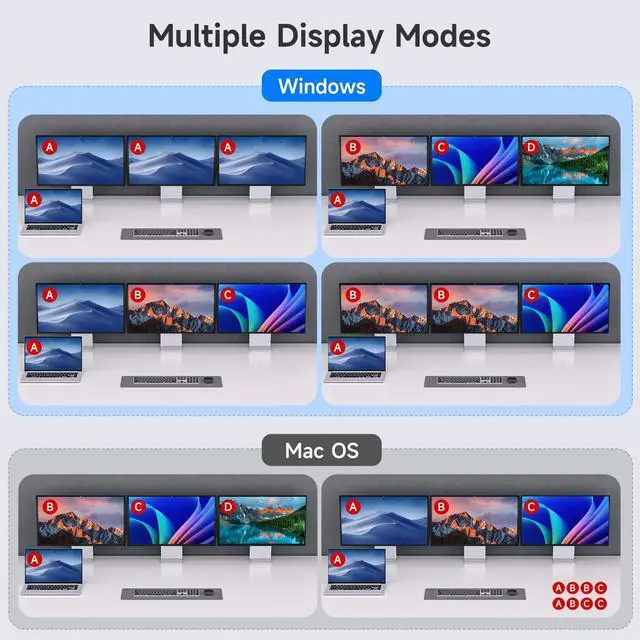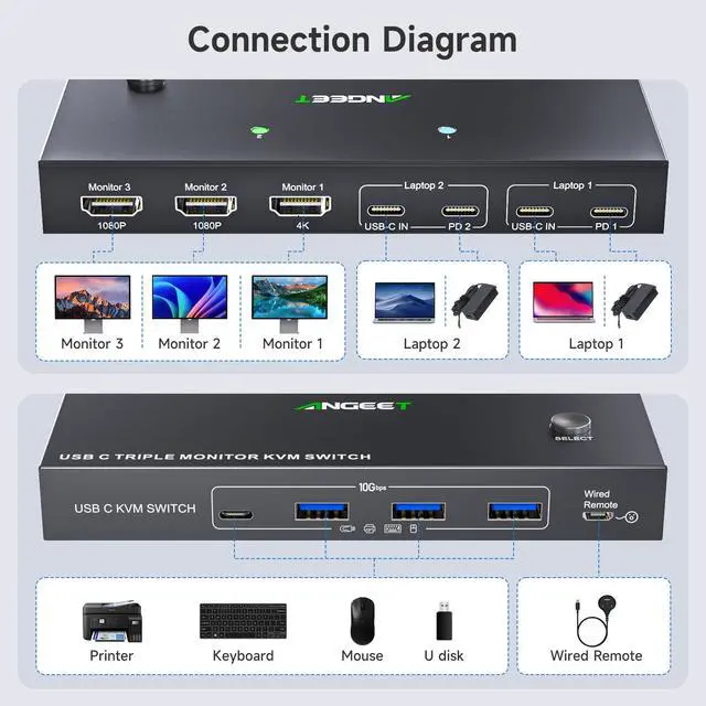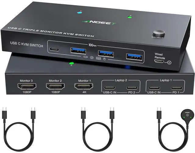 USB C Docking KVM Switch 3 Monitors 2 LaptopsThe USB C 3 monitor KVM switch combines USB-C docking station and 3 monitors KVM switch, which not only does it expand your laptop into a workstation with 3 HDMI monitors, 4x USB 3.2 ports (3USB-A + 1USB-C), and 2*80W PD charging ports, but also allows to one-click switching between 2 laptops. ^^ The 2 computers 3 monitors KVM switch supports simultaneous output of 3 HDMI monitors, with resolutions of 1*4K@60Hz+2*1080P@60Hz.: After connecting your laptops to the USB C KVM switch, the laptop will automatically recognise the USB device and a pop-up window will appear, please follow the wizard to install the USB driver. This driver does not record any information, Only used for identifying monitors. ^^ 3 Monitors KVM Switch with 4 USB 3.2 PortsThe triple monitor KVM switch USB C docking station is euqipped with 4 USB 3.2 ports(3USB-A + 1USB-C) for connecting keyboard, mouse, external hard drives, etc. With a data transfer rate of up to 10Gbps, Backward compatibility with USB 1.1 / 2.0 / 3.0. ^^ Charge your laptops via KVM SwitchKVM switch 3 monitors 2 computers USB C features with 2x80W PD charging ports, simply plug your laptop charger into the PD port to charge your laptop, eliminating the hassle of limited laptop ports.: It is necessary to plug the laptops charger into the PD port to power the KVM switch for stable operation. ^^ Wide Compatibility & Two Switching Ways The 2 port USB C 2 laptops 3 monitors KVM switch is effortlessly compatible with Windows and Mac OS. Supports two switching methodsphysical button and wired remote( 1.5 m), while LED indicators clearly display the active computer. ^^ ()Driver installation is required to recognize the monitors; (2) To get the 2 computers 3 monitors USB-C KVM switch work properly, the laptop system must be 11th or above; 3It is necessary to plug the laptops charger into the PD port to power the KVM switch; (42 USB C cables in the packaging, but HDMI cables are not included. (5) Not supporting EDID emulation and hotkey switching. Any problem, just take a little time to email us, you will receive a 100% satisfactory solution.