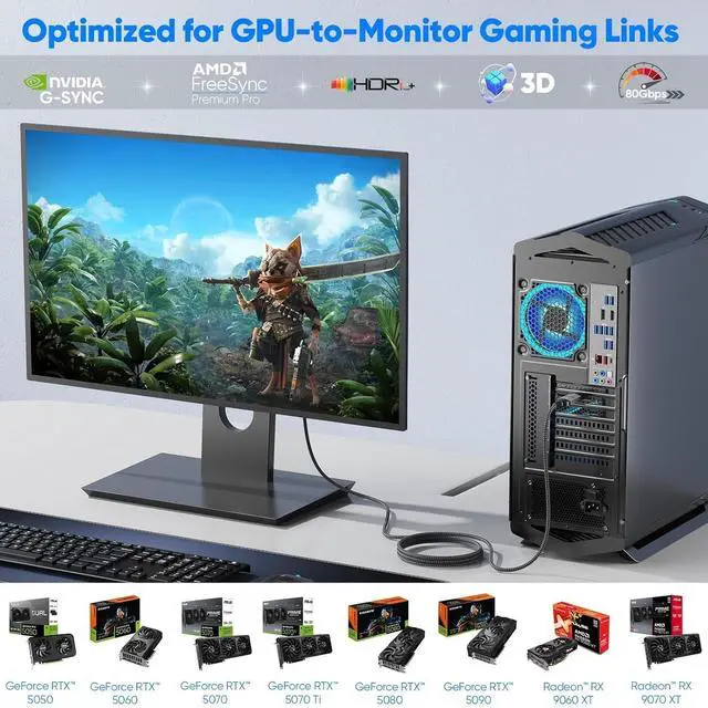 Wide Compatibility: Plug-and-play display port 2.1 cord works with any DP-equipped devicemonitor, desktop, laptop, mini PC, KVM, docking station, hub. It also supports popular graphics cardsincluding the Nvidia RTX 3060, RTX 3070, RTX 3080, RTX 3090, RTX 4090, RTX 4080 Ti, RTX 5070 Ti, and RTX 4070 Timaking video editing and PC gaming effortless ^^ 18
