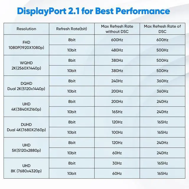 Bandwidth: DP 2.1 cable supporting uncompressed 16K@60Hz, 8K@120Hz, and buttery-smooth UHD 4K@240Hz, WQHD 2K@360Hz FHD 1080P@360Hz (DSC 1.2 a), backward compatible with DP 2.0 / 1.4 / 1.2, and supports up to 80 Gbps bandwidth ^^