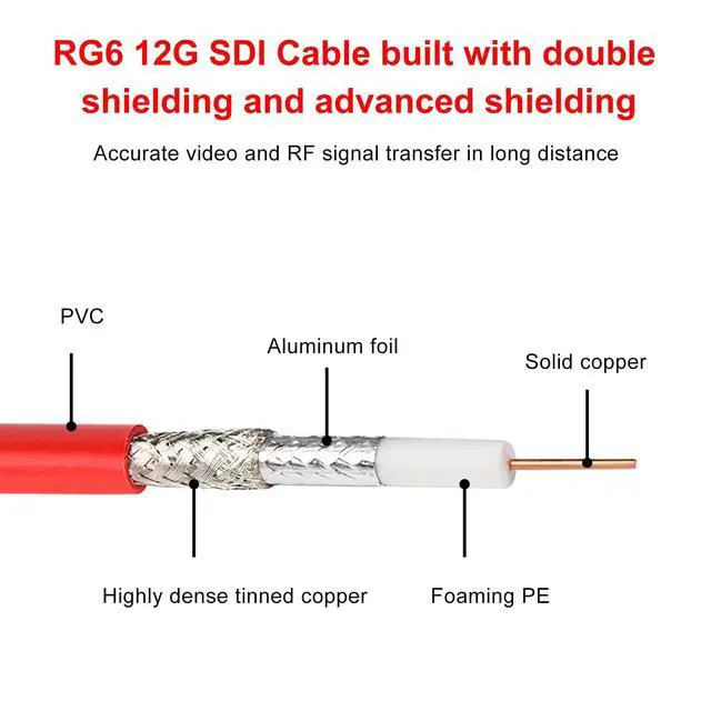 The 12G-SDI cable offers an impressive high data transfer rate of 12 gigabits per second (Gbps), ensuring smooth handling of HD, 3G, 6G, and 12G SDI video signals and making it suitable for demanding applications in broadcast and video production. ^^ Designed to support 4K Ultra High Definition (UHD) video resolutions, the 4K SDI cable ensures crisp and clear image quality, meeting the requirements of modern high-resolution video. ^^ This SDI cable features a robust construction with RG6 SDI Cable, providing low attenuation, and shielding against interference. With double shielding and brass copper connectors, it ensures durability, flexibility, and reliable performance, even in challenging environments such as outdoor use.
