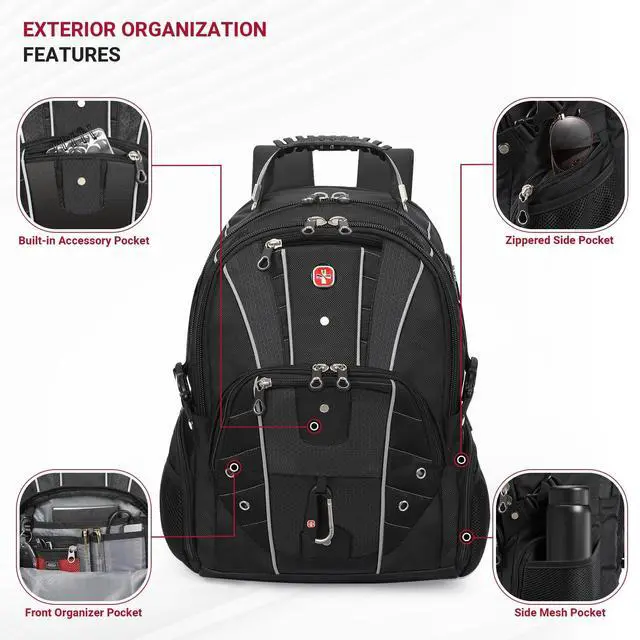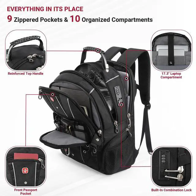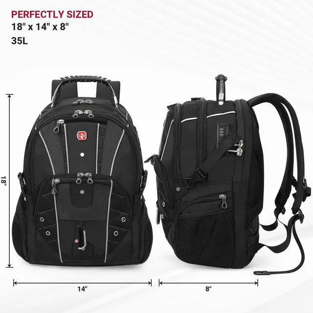 Includes a quick credit card slot, side water bottle mesh pocket, and snack pocket. Perfectly sized at 18" x 14" x 8" (35L) for carry on travel. ^^ LARGE CAPACITY & SMART ORGANIZATION Stay organized with this large-capacity tech backpack featuring 6 main pockets, including a front organizer pocket for chargers, cables, mouse, and accessories, two quick-access pockets for passport, wallet, or phone, a spacious main compartment for clothes or documents, and an independent padded 17-inch laptop compartment for secure protection. Ideal for business travel, daily commuting, and carry-on use.