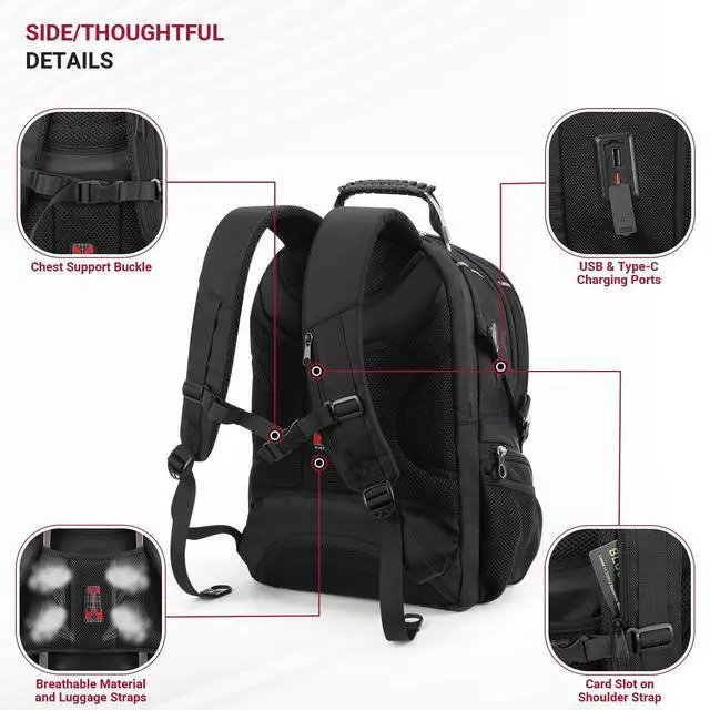 USB & TYPE-C CHARGING ON THE GO-Designed for modern professionals, this USB Type-C charging laptop backpack features both USB and Type-C external ports with a dedicated internal power bank pocket, allowing you to conveniently charge phones, tablets, or other devices while commuting, traveling, or working on the move. (Power bank not included) ^^ ANTI-THEFT & DURABLE EXTERIOR DESIGN-This anti theft lockable laptop backpack is built with an external combination lock to protect your laptop and valuables in crowded areas. Reinforced with a steel-wire durable top handle, metal hook, side compression buckles, and a rear luggage strap for suitcase attachment.