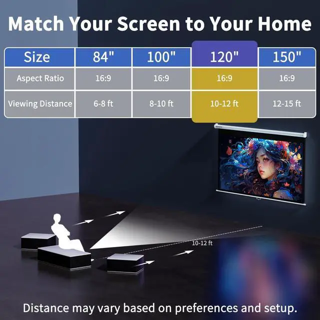 VISUAL FEAST: The 120 in retractable projector screen unique performance ensures that each incident light is evenly reflected; up to 178 panoramic viewing angle, 16:9 1.2 high gainthe screen supports 3D, 1080P, 4K, Full HD picture quality. It is recommended to use a medium-to-long focal length projector ^^