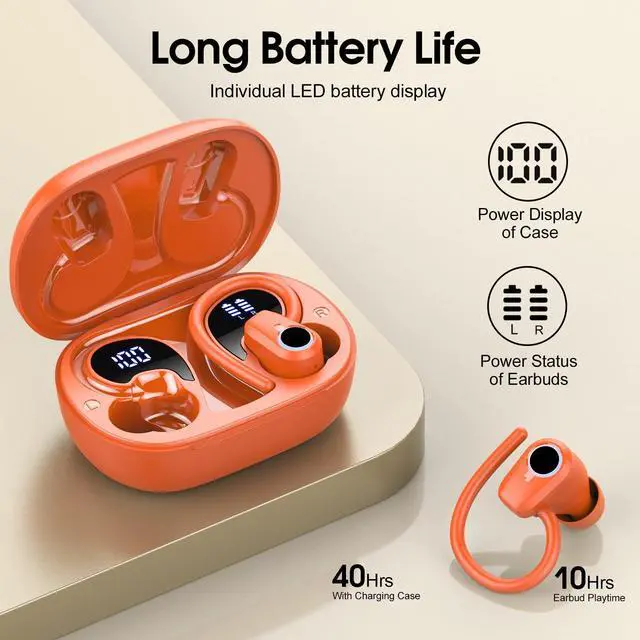 IP7 Waterproof: The wireless ear buds feature an ergonomic design for long-lasting comfort during workouts. Compared to regular sports earbuds, they are more compact and lightweight. The built-in TPU elastic ear hooks ensure a secure fit even during intense activities. The wireless earphones feature IP7 nano-coating waterproof technology, protecting against daily splashes, sweat, and rain, making them ideal for sports, fitness, and running ^^ Smart Touch and