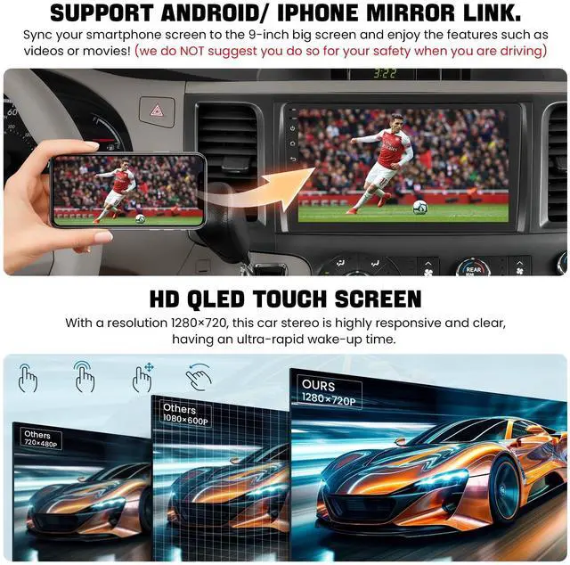 Perfect for sharing videos, navigation, and apps not yet supported by CarPlay or Android Autoall with a simple tap. ^^ Bluetooth & Voice Control Built for Sienna- Enjoy true hands-free freedom. This Toyota Sienna Stereo lets you make calls, play music, and control features using clear voice commandsall while keeping your focus on the road. ^^ QLED Touch Screen& High-Resolution 1280x720- Upgrade your dashboard with a vibrant QLED touchscreen designed specifically for the Sienna 2011-2014. Enjoy ultra-sharp graphics, smooth touch response, and brilliant clarity that makes every drive more engaging.