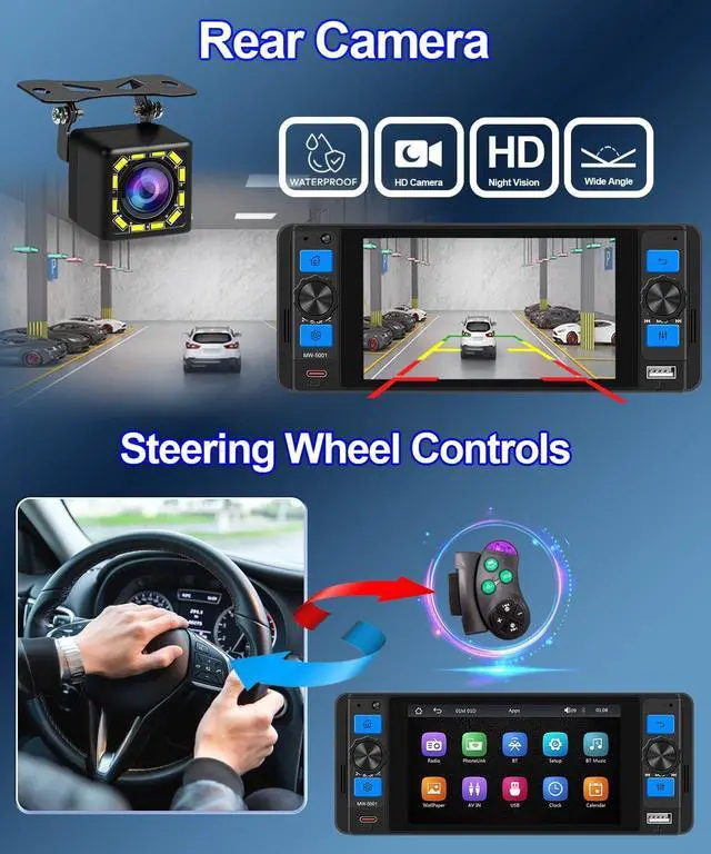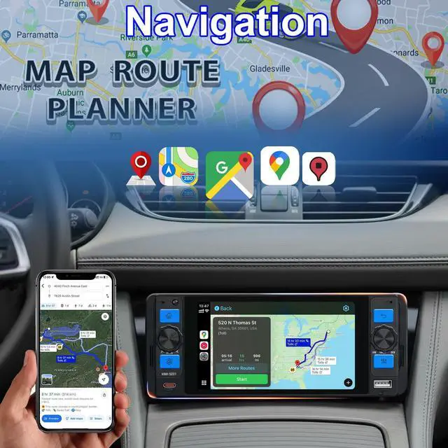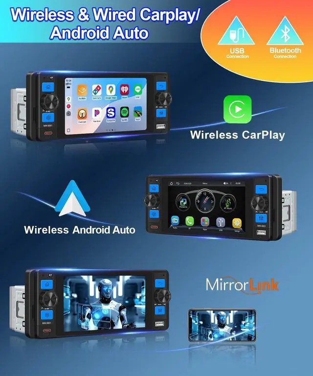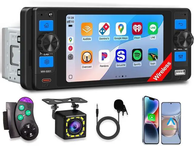 Wireless Apple CarPlay & Android Auto Access music, calls, and apps directly via your smartphone with this single DIN car stereo. ^^ 5 Inch IPS Touchscreen Display Responsive single DIN touchscreen radio with clear visuals and easy controls. ^^ Bluetooth 5.2 Hands-Free & Audio Stream music or take calls wirelessly with Bluetooth car radio. ^^ Backup Camera Support Enhance safety while reversing with this single din radio with backup camera. ^^ Phone-Based GPS Navigation Use Google Maps, Apple Maps, or Waze through Apple CarPlay or Android Auto, no built-in GPS required.