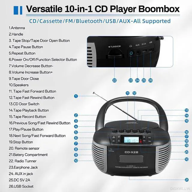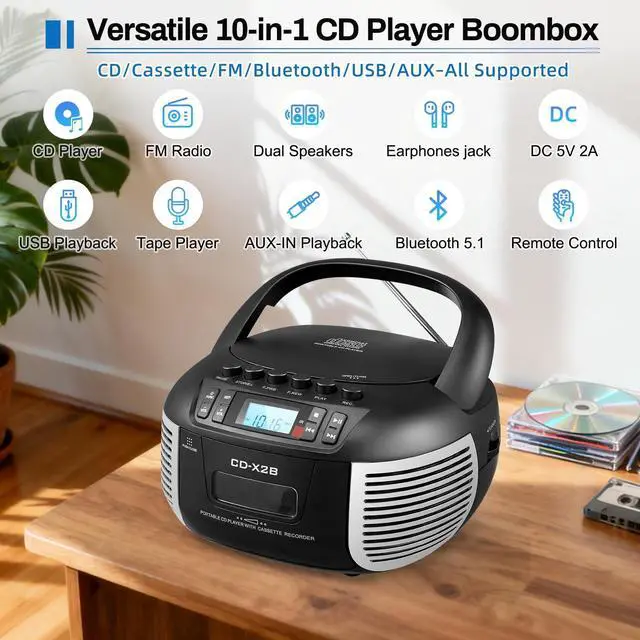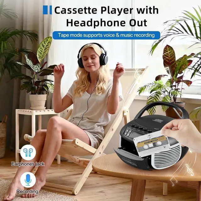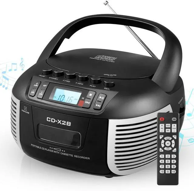 Versatile CD & Cassette Playback: Enjoy audio your way with this versatile boombox. Play standard CDs or MP3 files on CD-R/CD-RW discs, listen to cassette tapes, or stream music wirelessly through Bluetooth. It also accepts USB drives and AUX input, and includes FM radio for additional content. With a built-in headphone jack and remote control, you can conveniently enjoy music, radio, audiobooks, and personal playlists wherever you go ^^